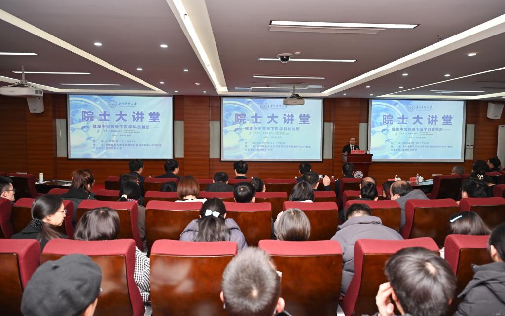 1月15日,贵州医科大学第六期“院士大讲堂”在北京路校区临床技能中心开讲。中国工程院院士,北京大学校务委员会副主任、北京大学国际癌症研究院院长、苏州大学苏州医学院院长詹启敏作学术报告。校党委书记何志旭主持会议并致欢迎词。校党委副书记、校长罗鹏,校党委副书记汤磊,副校长曾柱,附属医院党委书记李海洋、院长左石出席会议。相关职能部门,附属医院及各学院、重点实验室、工程中心主要负责人、教师代表和学生代表参加会议。